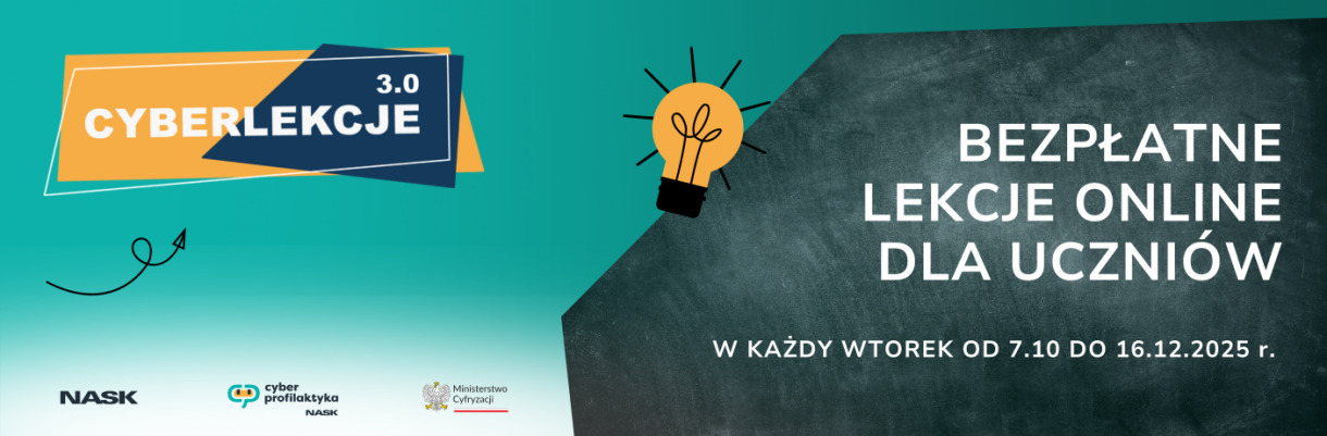 Zapraszamy uczniów i nauczycieli do udziału w jesiennej edycji cyklu bezpłatnych Cyberlekcji 3.0 w formule online, które odbywają się w każdy wtorek.Podczas spotkań poruszamy tematy ważne dla młodych użytkowników internetu: netykieta, dezinformacja, poszanowanie praw autorskich, wizerunek online, cyfrowy dobrostan czy przeciwdziałanie cyberprzemocy. Uczniowie dowiadują się, jak dbać o siebie i innych w sieci, jak rozpoznawać szkodliwe treści oraz jak odpowiedzialnie korzystać z nowych technologii.